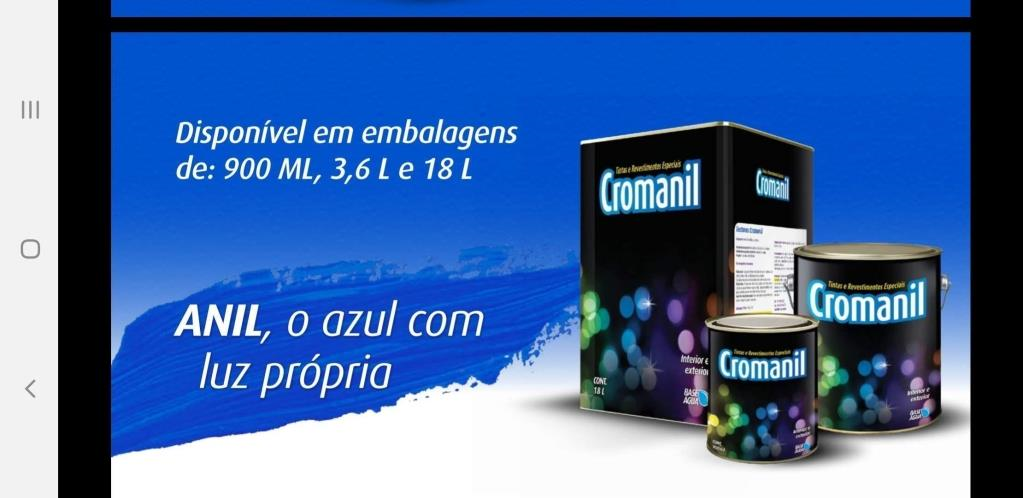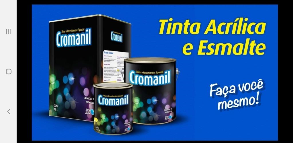 Cromanil Látex Acrílico é uma tinta à base de resina acrílica e de acabamento acetinado que possui excelente rendimento e cobertura Indicada para ambientes externos e internos. Manter o ambiente ventilado após aplicação.